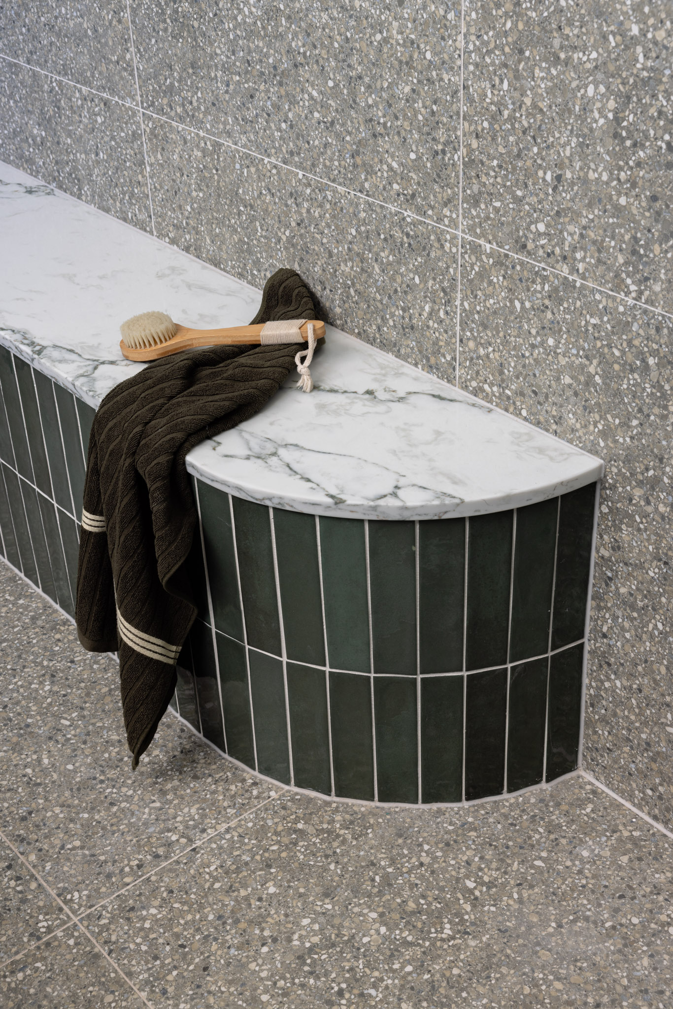 Working within existing constraints, we embraced a sculptural approach, opening up the bathroom into a generous wet zone, introducing a built-in bench, layered lighting, and custom cabinetry to enhance both flow and feeling. Textural finishes and warm brass accents bring depth and personality, while the laundry was refined with concealed storage and seamless functionality.