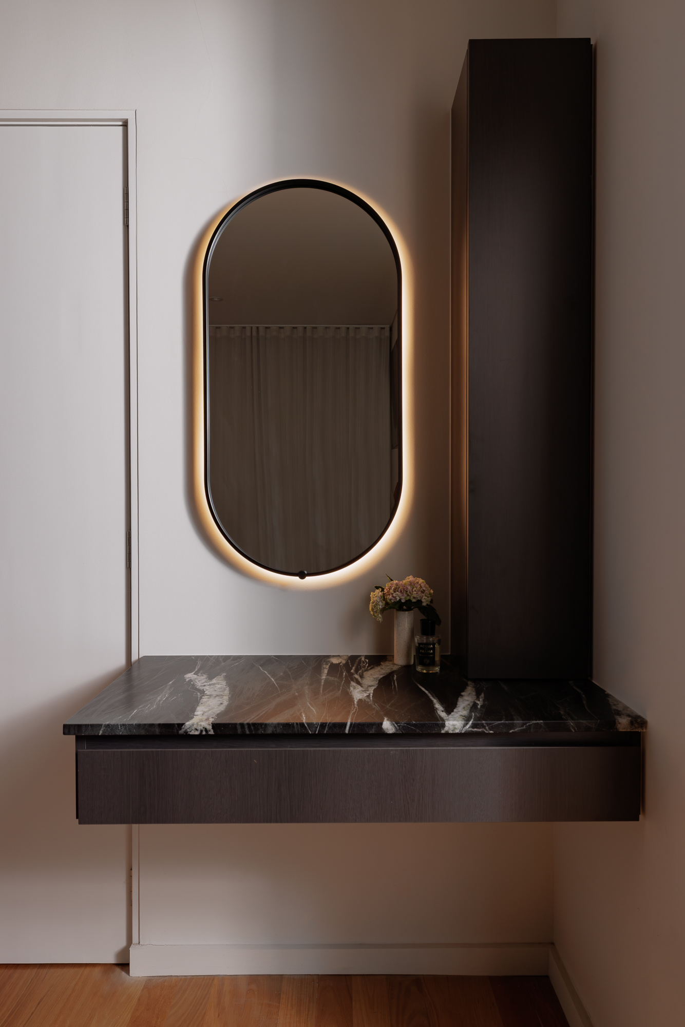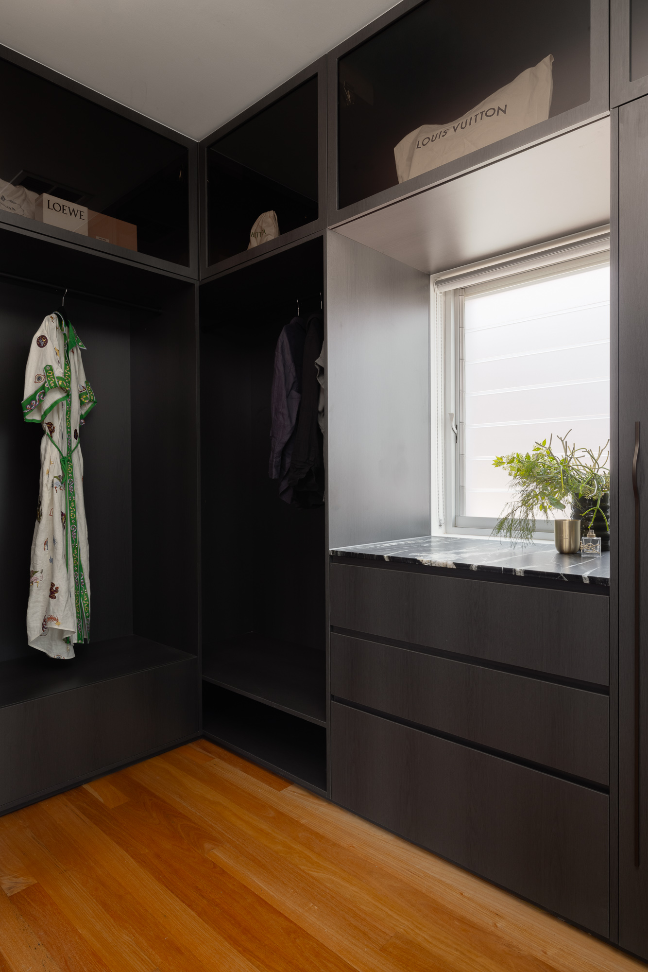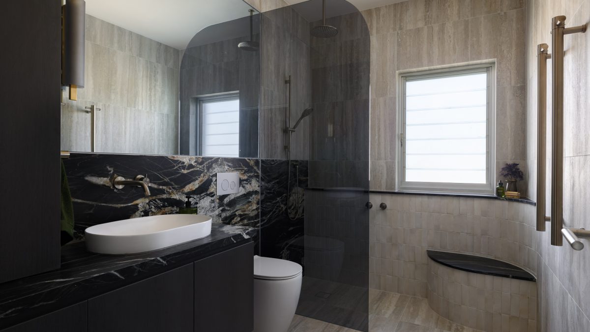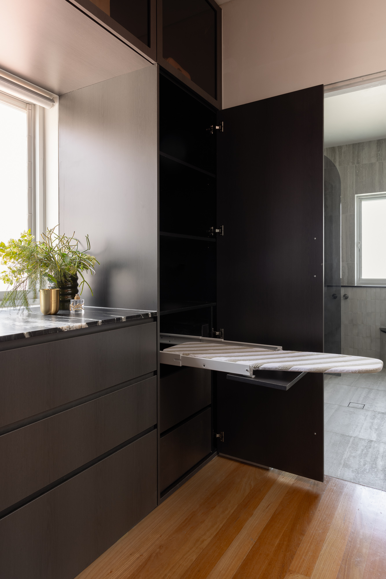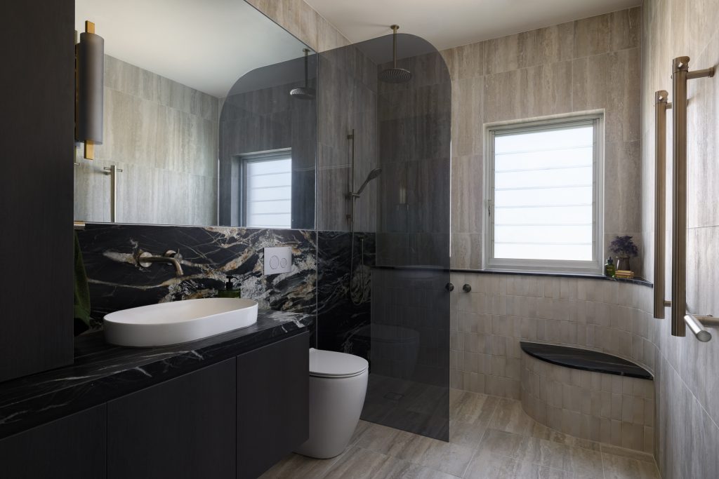 A luxury bathroom renovation in Abbotsford, this design + build project transforms our ensuite and walk-in robe into a cohesive, hotel-style retreat. Dark stone finishes, custom bathroom joinery, and layered lighting define the ensuite, while a bespoke walk-in robe renovation delivers increased storage and functionality. Subtle updates to the main bathroom and custom built-in study storage complete this considered interior renovation, creating a seamless, elevated home.