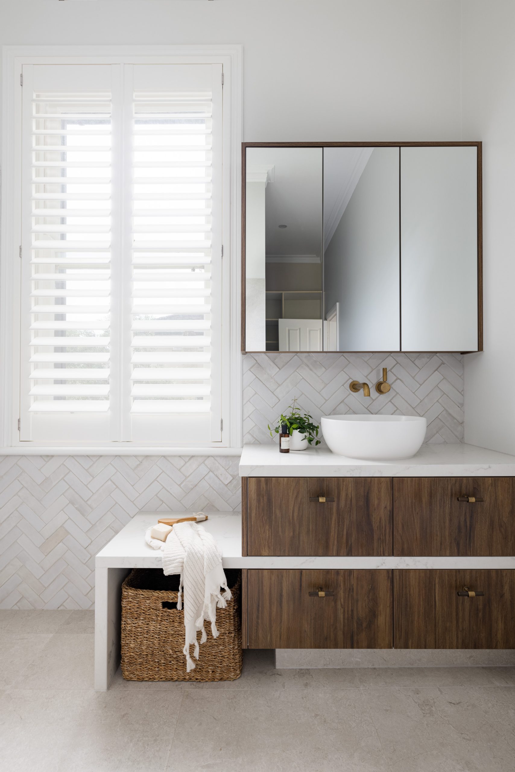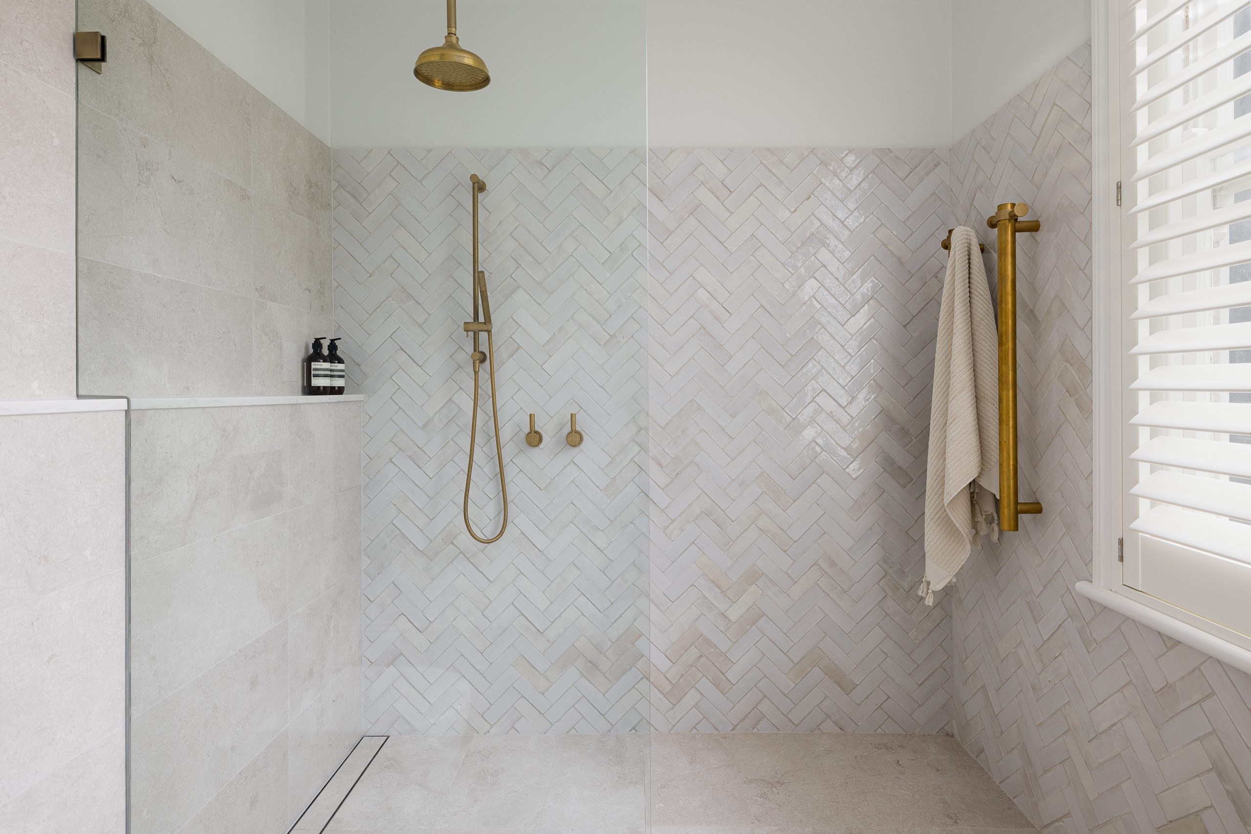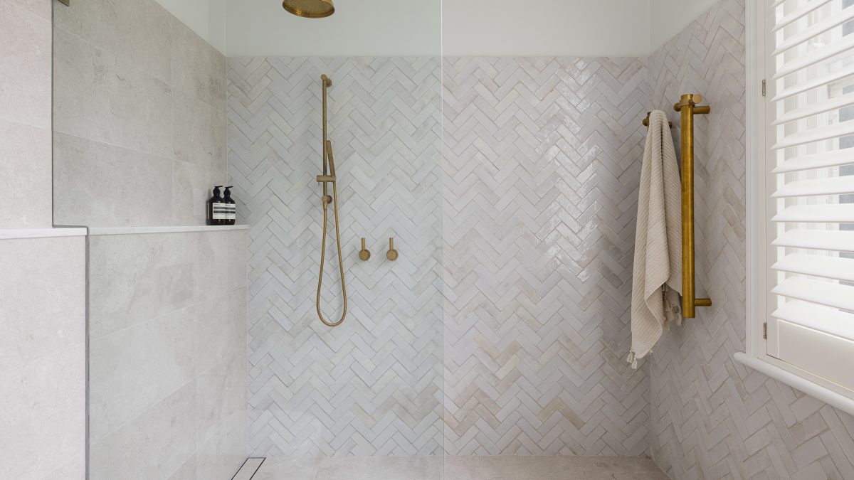 An Ensuite for TwoA continual wet floor from an oversized large shower, a small vanity impossible to share and a dark palette were the issues our clients faced. The dream: a calming ensuite that is easily shared with enough storage for all.