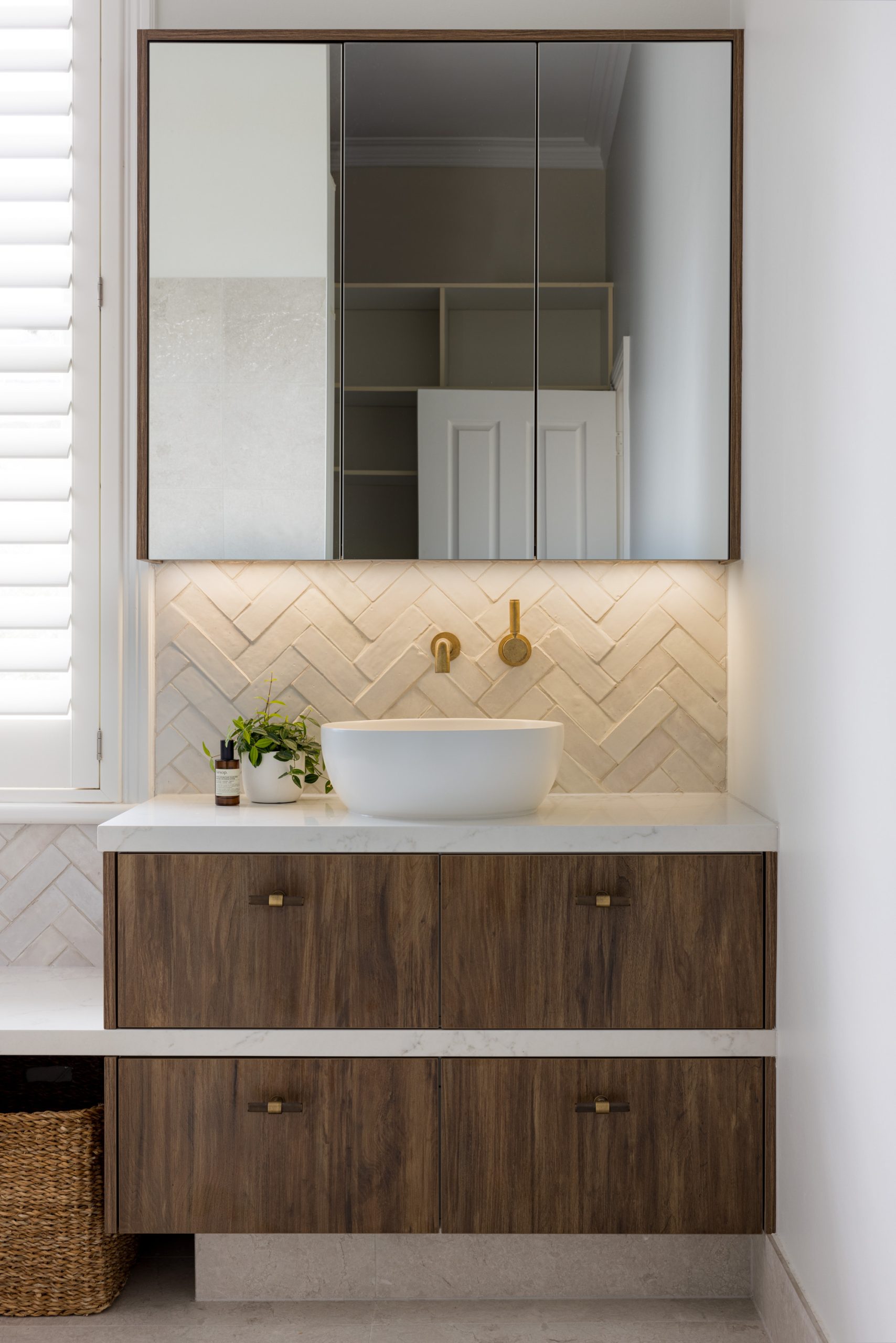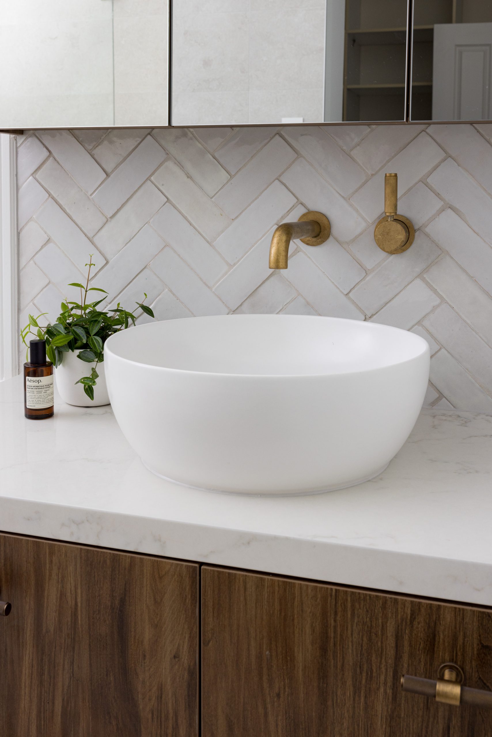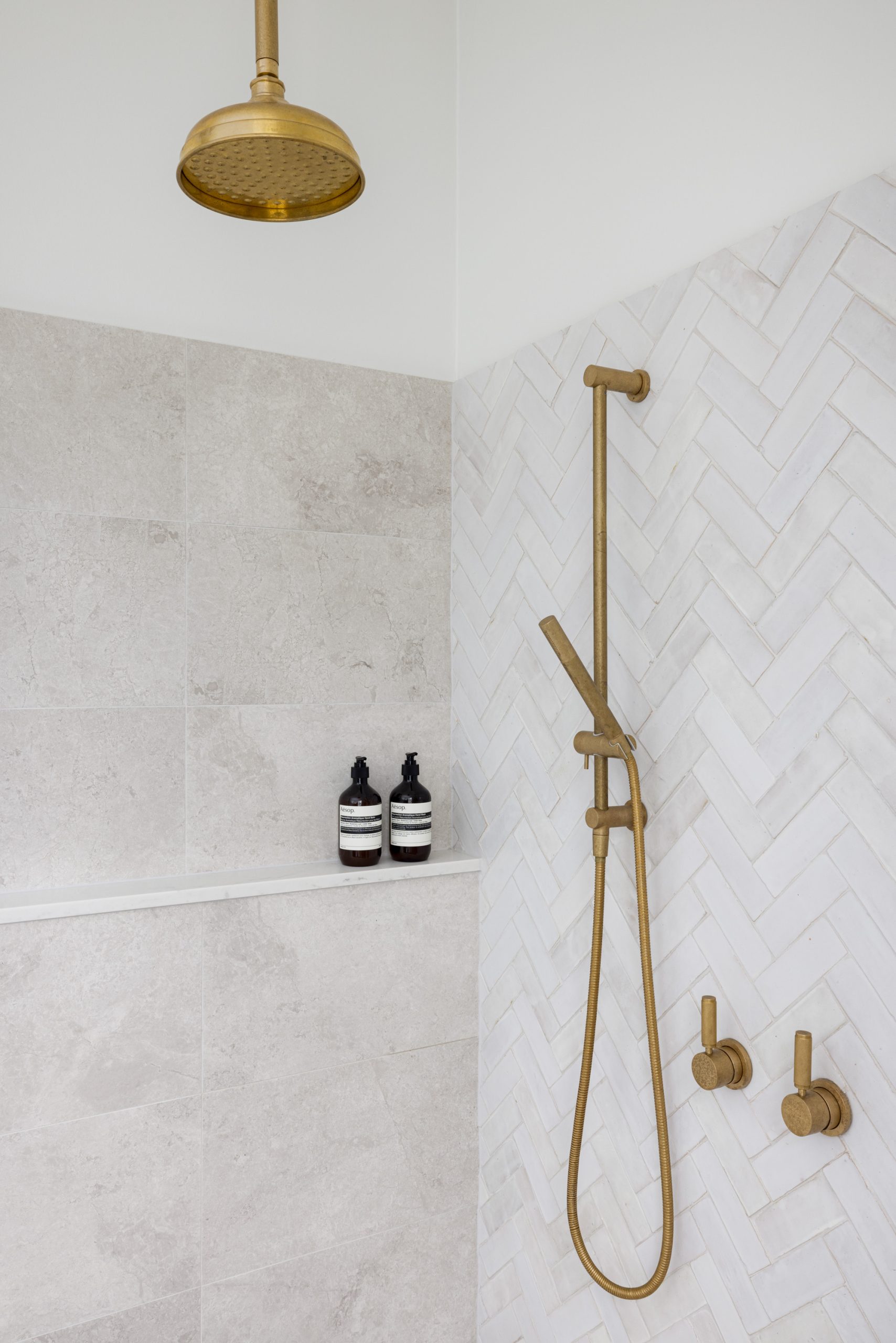 An Ensuite for TwoA continual wet floor from an oversized large shower, a small vanity impossible to share and a dark palette were the issues our clients faced. The dream: a calming ensuite that is easily shared with enough storage for all.