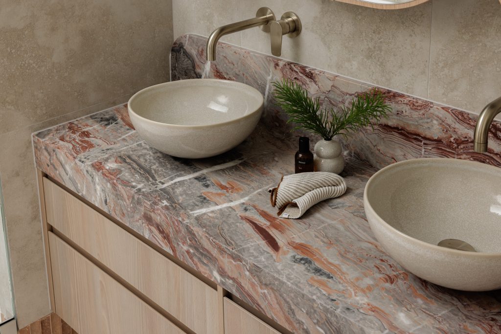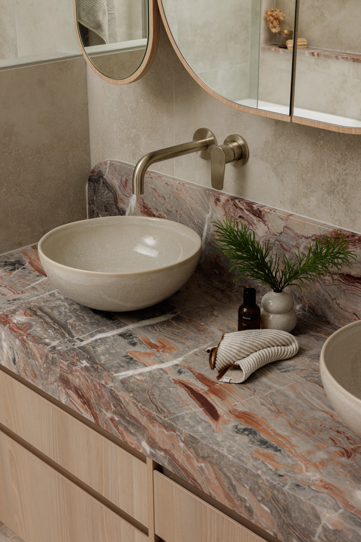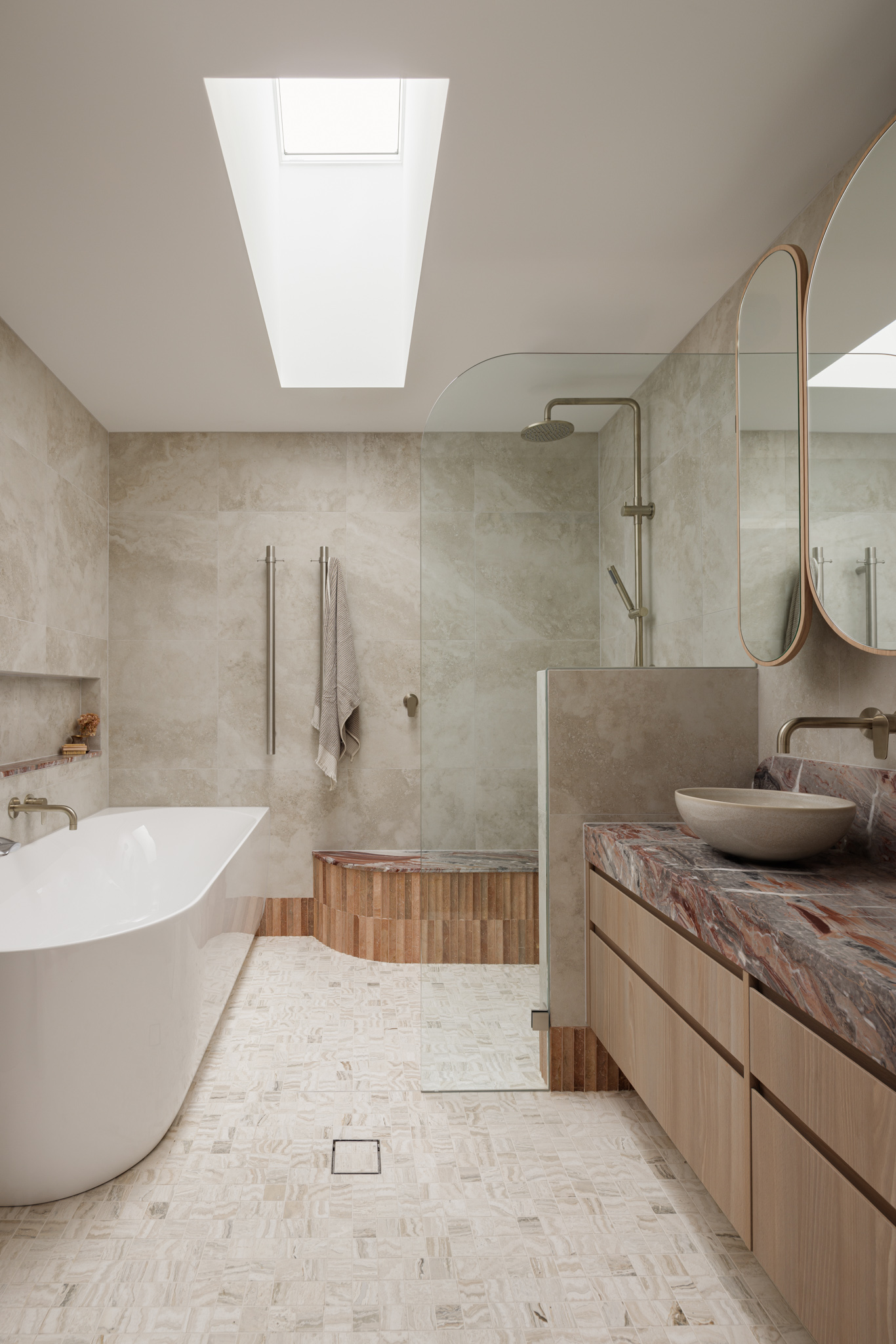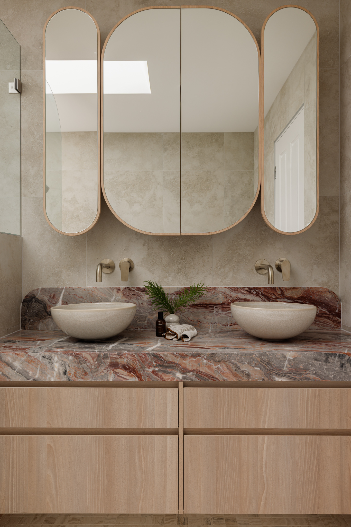 Through considered planning and a fully managed design and build approach, we introduced smarter layouts, custom joinery, a new skylight, and layered lighting to enhance both space and usability. Textural stone finishes and bold accents elevate the rooms, delivering bathrooms that are highly functional, beautifully resolved, and designed to live well every day.
