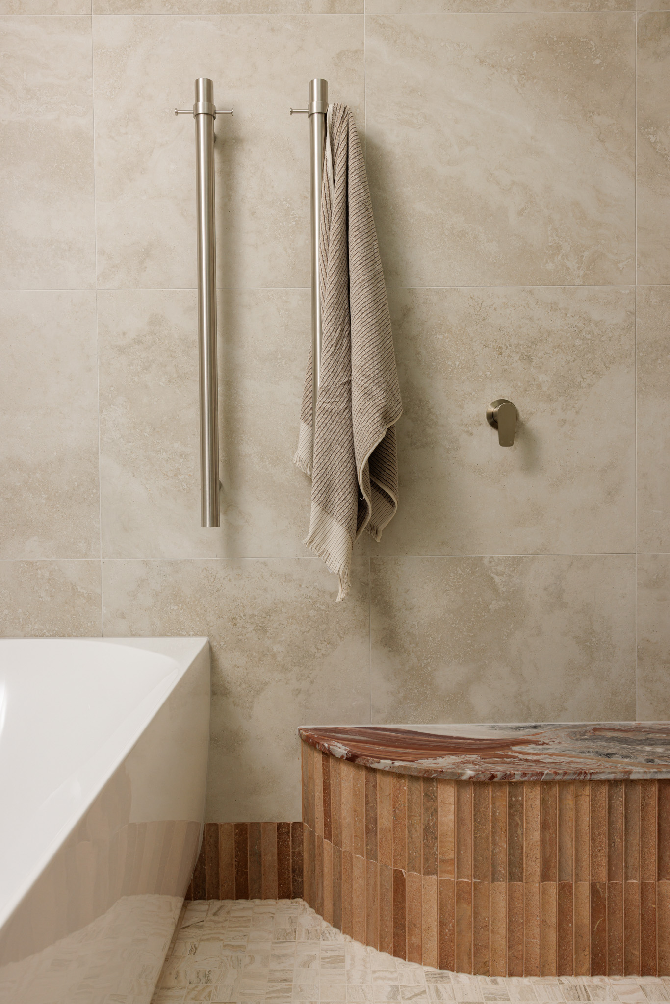 This Rozelle townhouse renovation reimagined both the ensuite and kids’ bathroom to meet the demands of a busy family of four. Working within fixed plumbing locations and limited natural light, the challenge was to significantly increase storage and functionality without compromising flow or sophistication.
